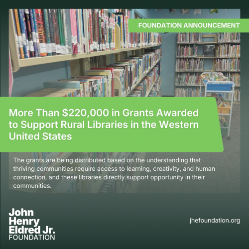 PROWERS COUNTY, Colorado (The Prowers Journal)-- Thirty-nine small public libraries across the Western United States are receiving a combined total of $220,050 in new grants, announced the John Henry Eldred Jr. Foundation. These libraries, spanning Alaska, Arizona, California, Colorado, Idaho, Montana, Nevada, New Mexico, Oregon, and Utah, collectively serve more than 247,000 individuals in rural communities, with populations ranging from 180 to 17,310 residents.